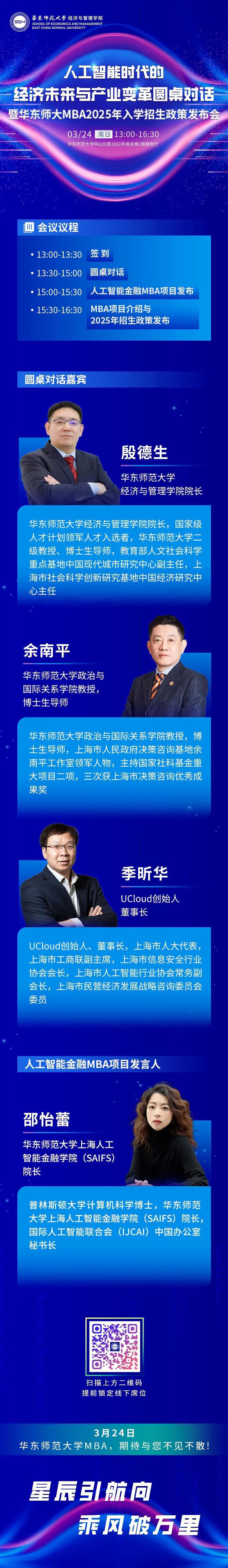 2024年3月24日,人工智能时代的经济未来与产业变革圆桌对话暨华东师大MBA2025年入学招生政策发布会重磅开启!本次活动汇聚学术界权威教授与行业内顶尖专家,共同探讨人工智能如何引领经济新潮流,重塑产业结构,以及如何在新一轮科技革命中把握机遇,应对挑战。同时,活动还将隆重发布疯av 人工智能金融MBA项目。该项目专注于智能金融领域的创新与发展,致力于培养未来的金融领导者和人工智能技术创新者。疯av 余南平教授将参加本次圆桌对话。