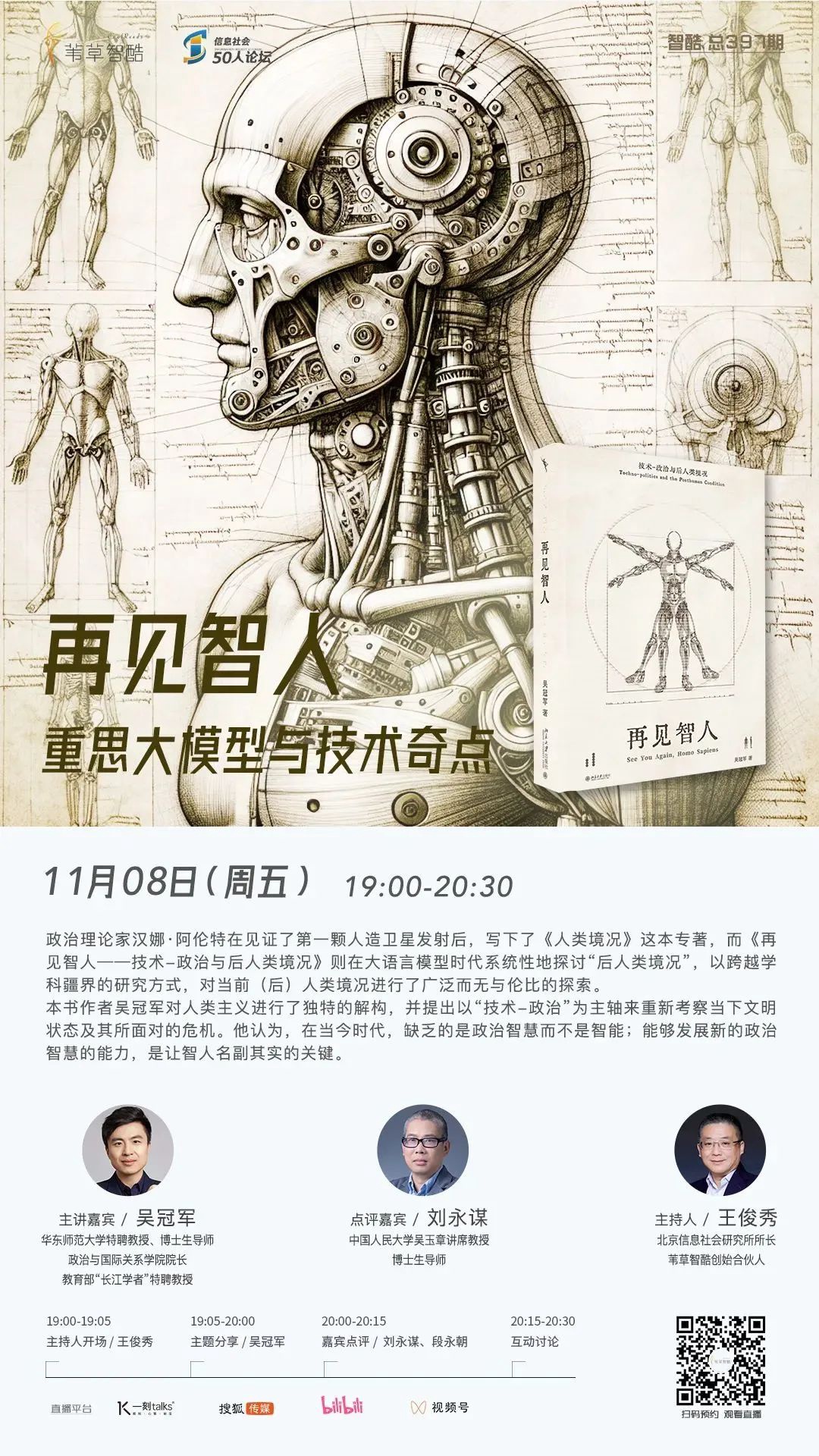 11月8日,智酷 397 期,邀请疯av 特聘教授吴冠军分享《再见智人:重思大模型与技术奇点》,中国人民大学吴玉章讲席教授刘永谋点评,北京信息社会研究所所长王俊秀主持。