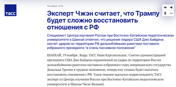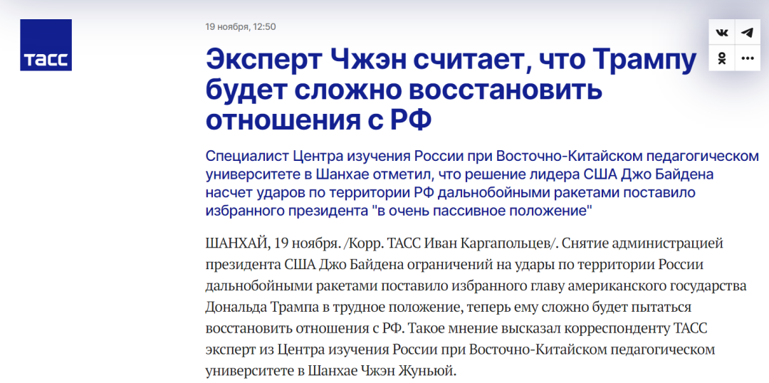 媒体视野|郑润宇接受塔斯社采访 评拜登解除禁止乌克兰使用美国提供的武器袭击俄罗斯境内纵深目标