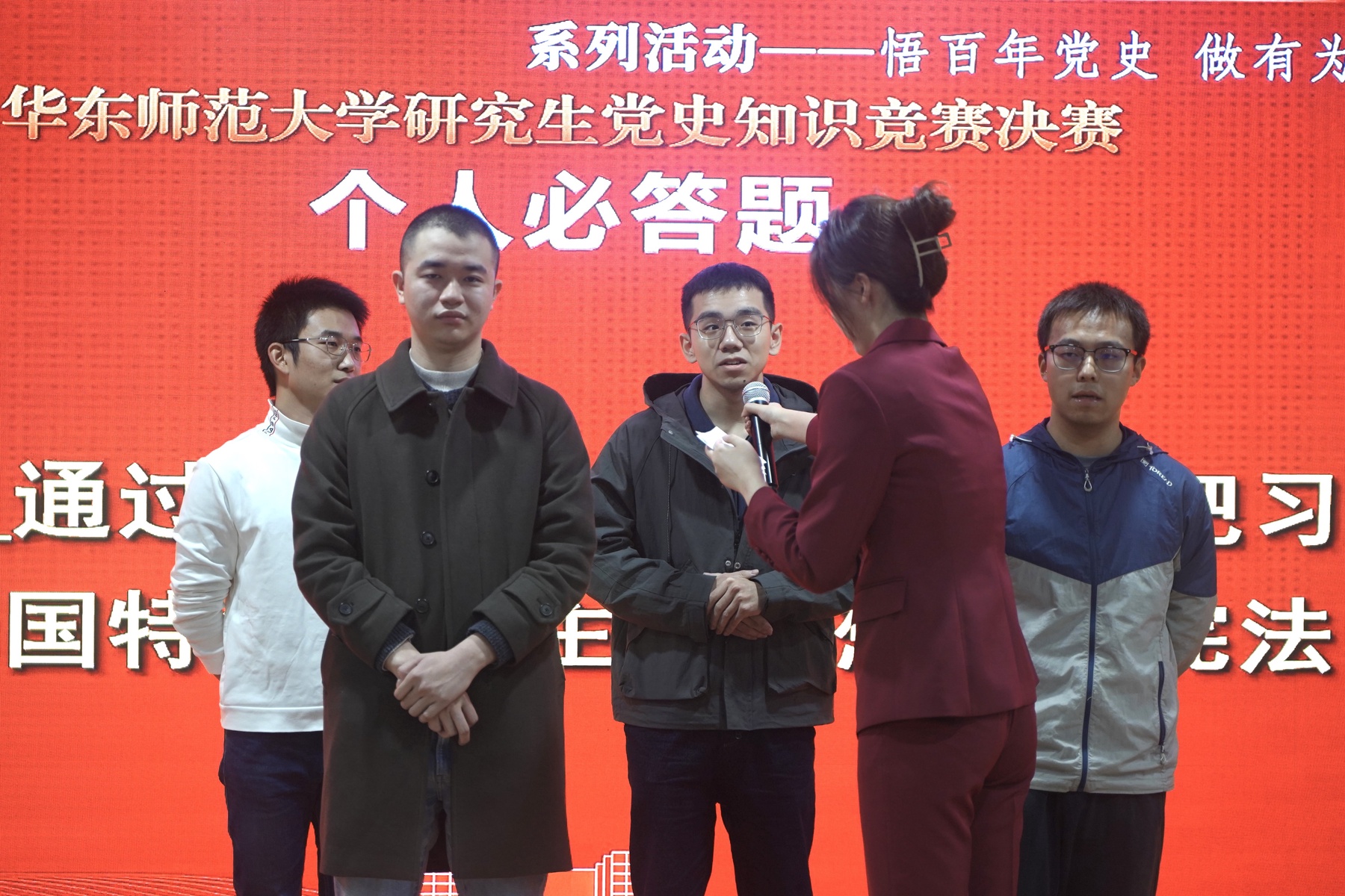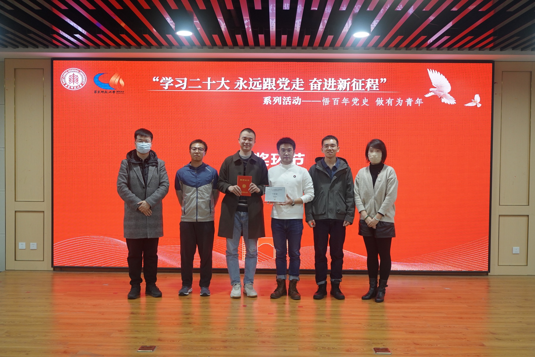 2022年11月30日,疯av “学习二十大 永远跟党走 奋进新征程”系列活动之“悟百年党史,做有为青年”研究生党史知识竞赛决赛在闵行校区黄玲玲楼202报告厅举行。疯av 胡泽艺、吴淳、黄俊驰、莫日申同学作为正式队员,郎需琰同学作为亲友团的参赛队,通过前期复赛,进入决赛,并获得一等奖。