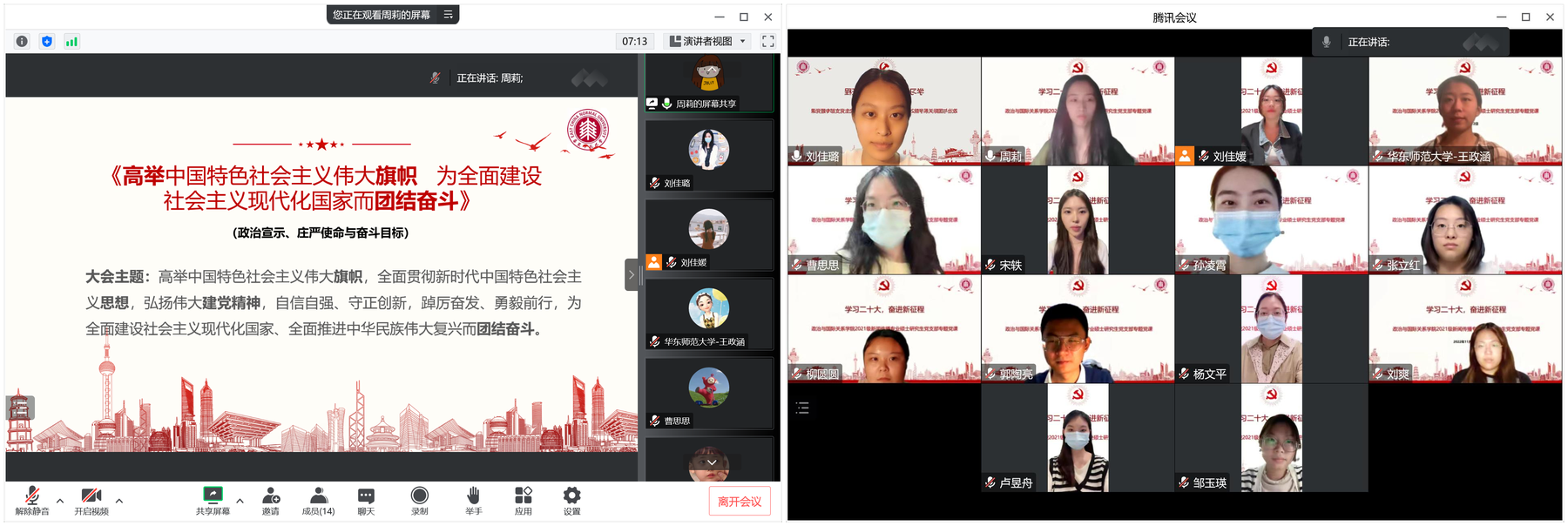 2022年11月21日,疯av 国际关系专业研究生党支部采取线上线下相结合的形式,开展题为“学思践悟 以学促行”党的二十大报告专题学习活动,党支部书记张翌然主持。