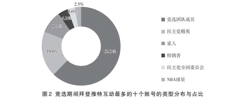 第一,拜登的框架代表了建制派的立场,在民主党精英中扩散,在较大范围形成一致的话语框架。对比拜登和特朗普大选期间在推特上互动最多的前十个账号的类型分布与占比,可以看到,拜登的推特有超过80%都是在与民主党成员互动,其中62.3%是与其竞选团队成员,特别是搭档哈里斯(@KamalaHarris)的互动,拜登有98条推特(37.2%)在提及或者转发哈里斯推特的内容(参见图2)。除此以外,接近20%的推特在和民主党主要的政治精英进行互动,包括前总统奥巴马及其夫人米歇尔、希拉里等。这些民主党精英的推特内容与拜登的“特朗普无计划”的话语框架保持高度一致。例如,在一段视频中,前总统奥巴马与拜登同时出镜,介绍了在他们执政时期早已有一本长达69页的有关传染病大流行的行动指南。但显然,特朗普政府把这个行动指南置于脑后了。