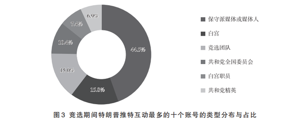 第二,特朗普的框架反映了反建制派的立场,即使在建制派的共和党精英中的扩散仍然相当有限,难以形成一致的话语框架。与拜登不同,在特朗普前十个互动最多的推特账号中,共和党成员的占比并不高,只有10.4%(参见图3)。但是,特朗普倾向于转发保守派媒体,如布赖特巴特网站或者保守派媒体节目主持人的推特的内容来强化自己的观点和话语框架。另一方面,只要有媒体对疫情防控做正面报道时,他便立即回应,从而再次把话题置于他的“防疫成就”的框架中。