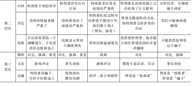 内容分析法与话语分析法用于对上述材料进行分析。内容分析法主要用于分析材料中的主题、主角、态度等可量化总结的变量。话语分析法主要用于挖掘框架元素(frame elements)及意义阐释。根据恩特曼的定义,框架由问题的定义(Problem definition)、因果解释(Causal attribution)、道德评判(Moral evaluation)以及方案(Treatment)四个元素组成。 我们通过话语分析法挖掘以上框架元素,并对比两位候选人及其所处党派政治精英的不同话语框架。媒体框架的分析有别于政治话语的框架分析。在结合恩特曼、甘姆森等人的研究后, 媒体话语的框架结构划分为三个层次,即包含新闻的主旨的第一层次;包含新闻的主要事件、语境、归因、评论以及结果的第二层次;以及包含新闻中所运用的修辞手法、文法组织以及比喻等微观层面的第三层次。换句话说,在两位候选人政治话语的框架分析的基础上,我们结合新闻报道的特征,加入对新闻主旨、新闻事件、新闻评论等元素的考察。