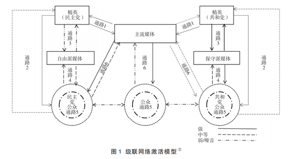 再次,在框架化效果方面,在新的级联网络激活模型中,公众被划分为三组:一组是支持民主党的公众;一组是支持共和党的公众;还有一组则是立场中立的公众,他们更多地接收主流媒体的信息。当公众分别接收来自各自支持的党派精英以及媒体的信息和观点时,他们对某些特定议题的观点便会得到强化,从而形成不同的政治态度。不同党派具有竞争性的政治观点和立场往往集中体现在民主选举的过程中。不同党派的政治候选人通过对同一议题的不同立场的表达来争取各自的支持者。在这种情况下,接收特定渠道信息的不同党派的支持者也便越来越容易形成“我们”与“他们”的定位区分,而针对某个议题的共识则越来越难以达成。
