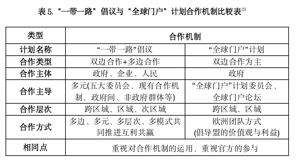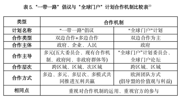 从合作机制来看,两者都十分重视合作机制的运用,但是却采用了不同的合作方式。“一带一路”倡议建立了一个在现有合作模式基础之上的多边、多元、多层的成熟稳定的合作机制,该机制基于公平互利的原则,能够保证沿线各国的有效参与。而“全球门户”计划则建立了一个以欧盟为主导,伙伴国家参与的合作机制。在这种机制下,由欧盟订立相应的规则与准入条件,其他国家想要参与就必须满足欧盟设施的具体条件,在运行过程中也将由欧盟机构负责主导,以欧盟的方式来与伙伴国合作。比较而言,“一带一路”倡议的合作机制更加成熟,也更能够被合作国接受。