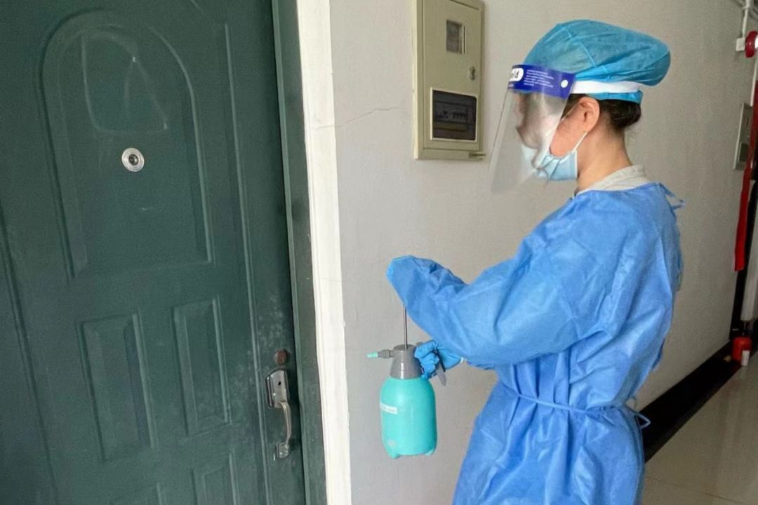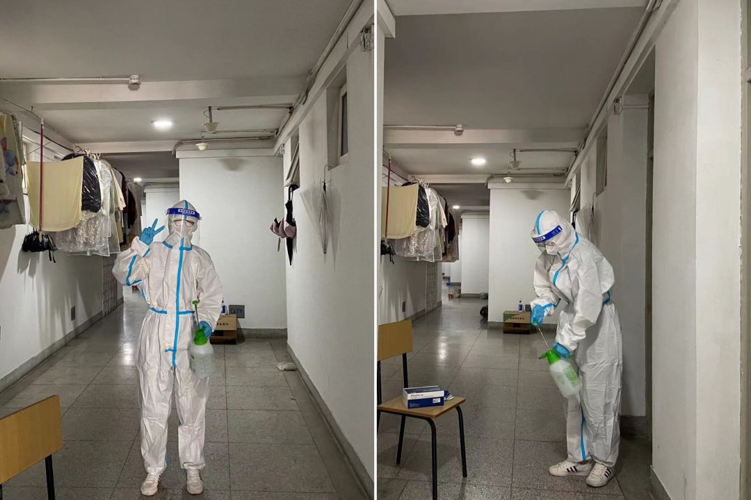 在封楼期间我曾做过午餐和晚餐配送的志愿者,深知志愿者工作的不易。看到层长每天上传下达各种通知,为了楼层尽心尽力,我想如果有机会我也要为同学们做些什么,所以一看到招募消杀志愿者的通知,我就立刻向层长报了名。消杀工作主要还是体力活。虽然每次穿着大白消杀的时候都会满身是汗,但我觉得很开心,因为每消杀一次就意味着我们的环境能得到更好的保障。大家再坚持一会,疫情一定会过去的。