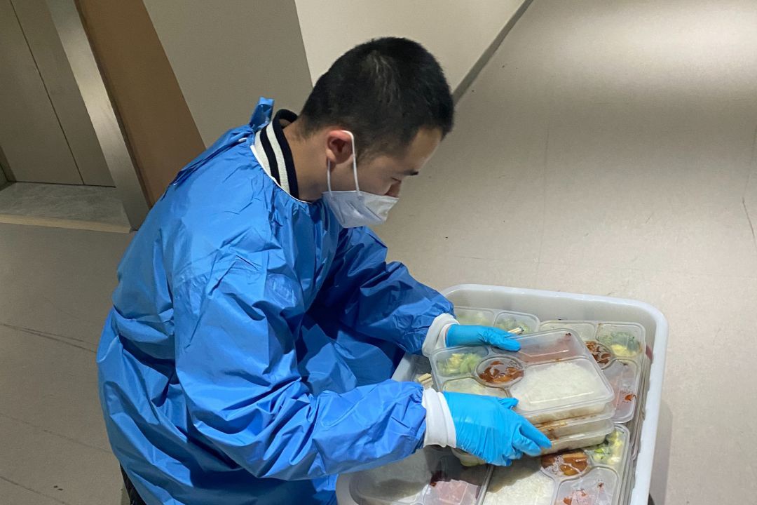 自疫情爆发以来,我一直在积极报名宿舍片区的志愿者,并多次承担了送饭、搬运物资、维持核酸检测秩序等方面的任务。每一次送饭都是一件非常艰苦的事情。穿着防护衣的“大白”将我们一层楼的饭送到电梯口,然后我再花上十分钟左右的时间将每一个人的饭都送到各自的宿舍门口。一整套流程下来,全身上下都是汗水,但一想到大家都能够吃上热腾腾的饭,我心里面是非常高兴的!