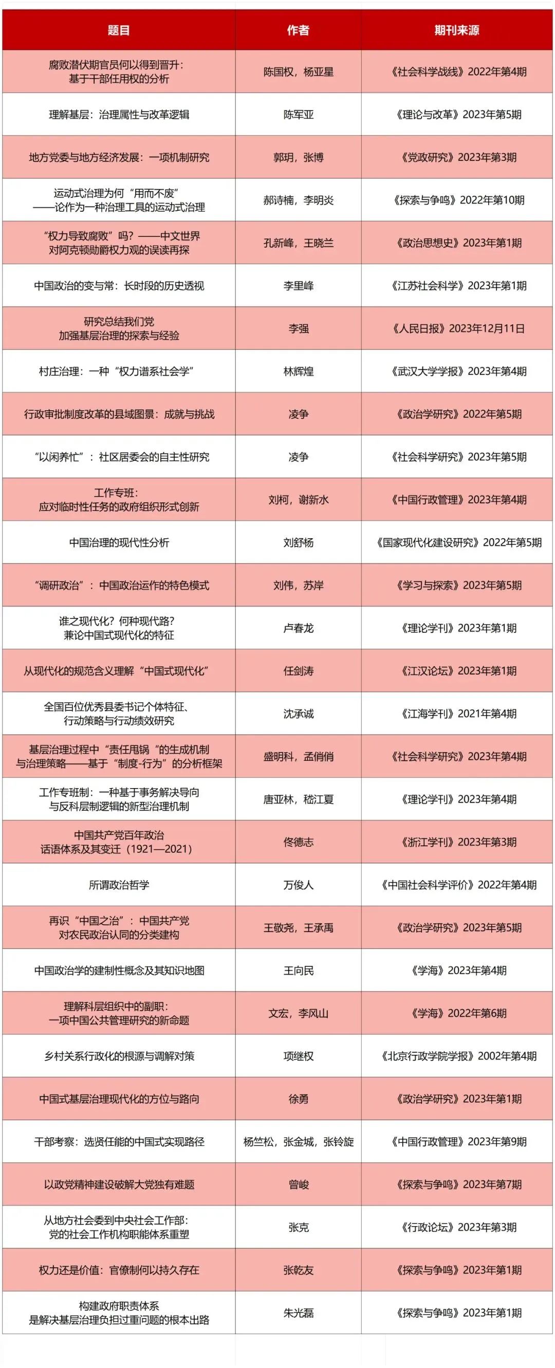 2023年度最受认可的政治学学术文章(TOP30)如下(排名按照作者姓名拼音顺序):