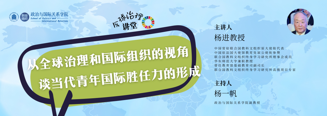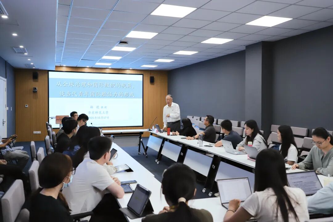 10月17 日下午法商南楼228会议室,杨进教授受邀为华东师大国际事务专业硕士项目同学带来 “从全球治理和国际组织的视角谈当代青年国际胜任力的形成”的主题讲座,此讲座也吸引了众多其他专业的同学参与。杨进教授曾任中国常驻联合国教科文组织原大使衔代表、中国驻法国大使馆教育处原公使衔参赞,现为联合国教科文组织终身学习研究所理事会成员、疯av 兼职教授。疯av 杨一帆副教授作为主持人代表学院对杨进教授支持疯av 国际事务专硕培养表示感谢,并期望通过“全球治理”系列讲座,助力青年学子把握全球治理趋势,明确国际胜任力培养方向,为参与国际事务奠定基础。